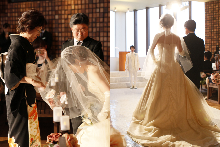 母にベールダウンをしてもらい、父と歩むバージンロード。