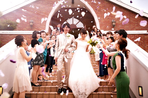 ゲストの祝福に包まれるフラワーシャワー・・・