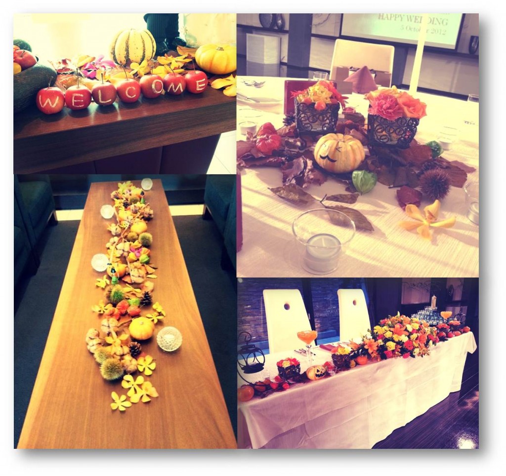 ジャクオーランタンに見立てたミニカボチャや栗、秋をイメージしたお花やキャンドルが